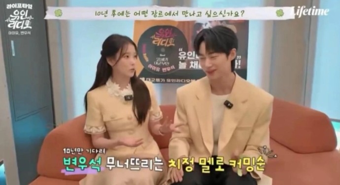 지난 22일 케이블 라이프타임에서 방송된 ‘유인라디오’에서 아이유는 10년 뒤에 변우석과 만나고 싶은 장르를 묻는 말에 “저희가 이제 나이도 있고 더 어른어른한 분위기가 날 거 아니냐. 그때 약간 완전”이이라고 운을 떼자 변우석 바로“치정?”이라고 정리했다.