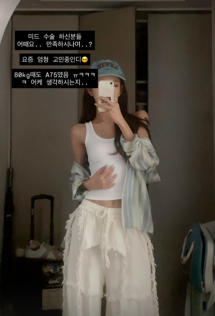 23일 최준희는 자신의 SNS에 “미드 수술 하신 분들 어때요. 만족하시나요. 요즘 엄청 고민 중인데. 80kg 때도 75A였음. 어떻게 생각하시는지”라고 글을 올렸다. 함께 공개한 사진에서는 흰색 나시에 와이드 팬츠를 입은 슬림한 몸매가 눈길을 끌었다.