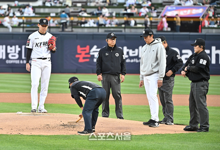 KT 선발투수 소형준(왼쪽)이 23일 수원 KT위즈파크에서 열린 2026 KBO리그 KIA와 경기에 앞서 연습 투구를 하던 중 마운드의 흙더미가 떨어져 나와 급하게 그라운드 정비가 진행되고 있다. 2026. 4. 23.