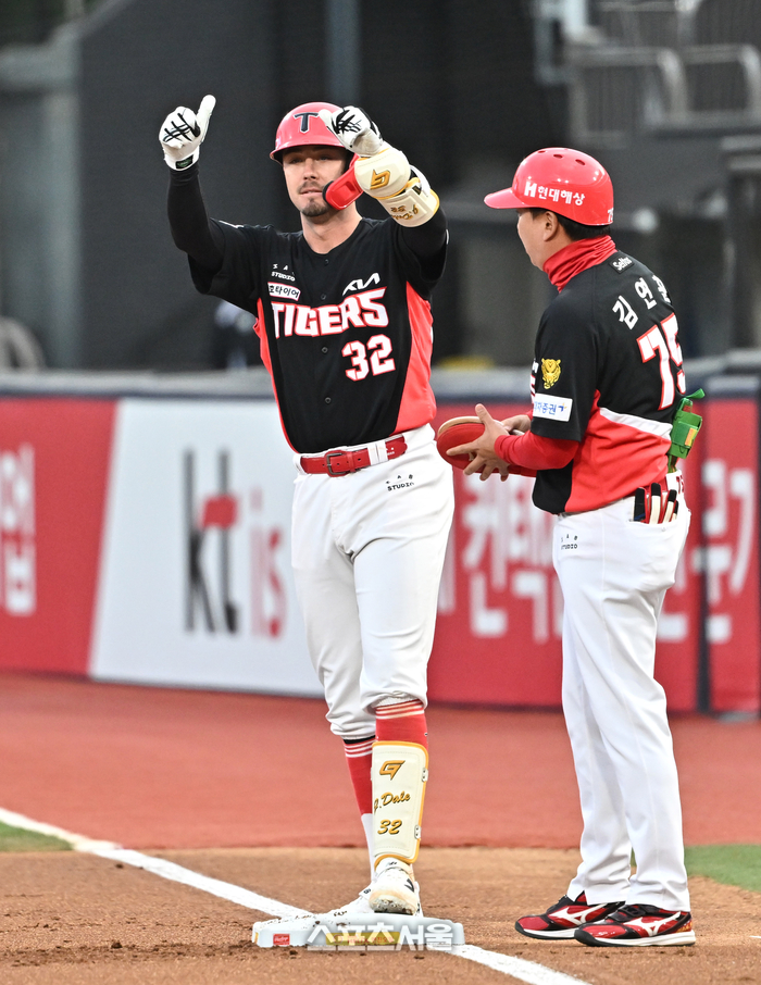 KIA 데일이 23일 수원 KT위즈파크에서 열린 2026 KBO리그 KT와 경기 1회초 무사 KT 소형준을 상대로 안타를 친 뒤 세리머니를 하고 있다. 2026. 4. 23.