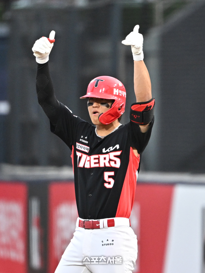 KIA 김도영이 23일 수원 KT위즈파크에서 열린 2026 KBO리그 KT와 경기 1회초 무사 만루 상황에서 KT 소형준을 상대로 1타점 적시타를 친 뒤 세리머니를 하고 있다. 2026. 4. 23.
