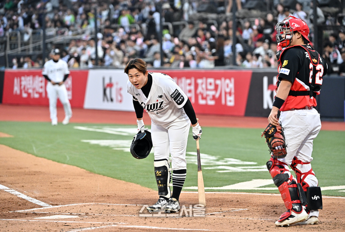 KT 최원준이 23일 수원 KT위즈파크에서 열린 2026 KBO리그 KIA와 경기 1회말 첫 타석에 들어서면서 KIA 이범호 감독을 향해 인사를 하고 있다. 2026. 4. 23.