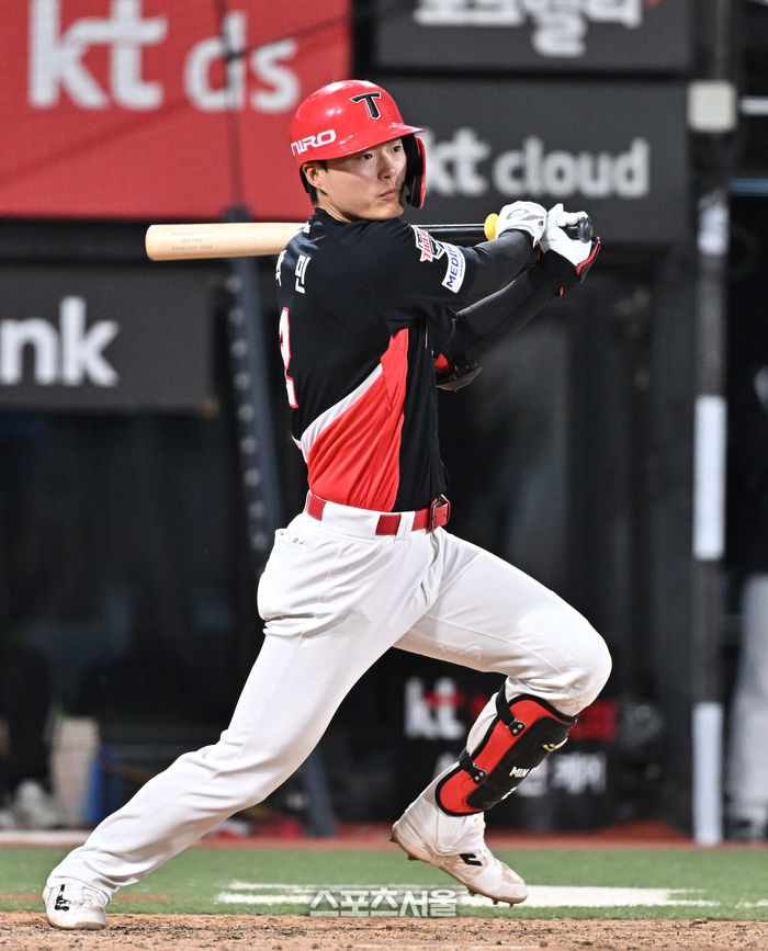 KIA 박민이 23일 수원 KT위즈파크에서 열린 2026 KBO리그 KT와 경기 4회초 2사 1루 상황에서 KT 소형준을 상대로 안타를 치고 있다. 2026. 4. 23.