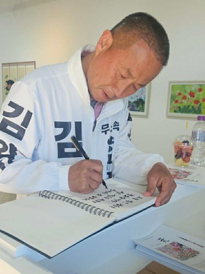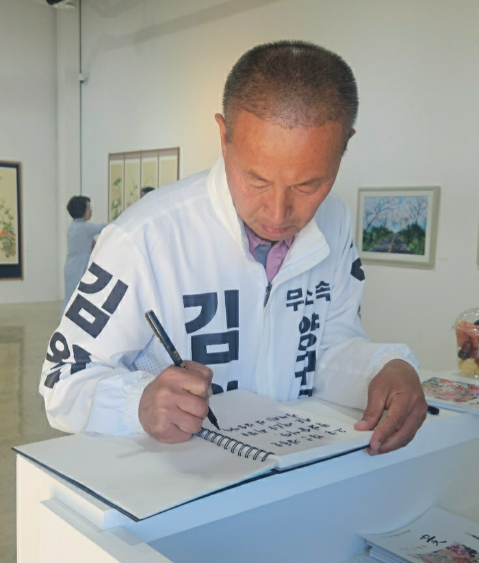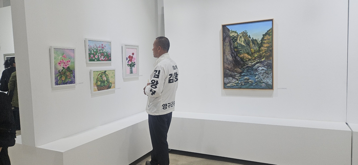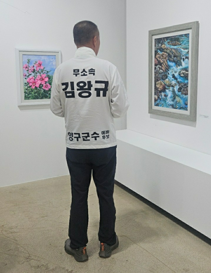 [스포츠서울ㅣ김기원 기자]김왕규 무소속 양구군수 예비후보가 24일(금) 버드나무예술창고 (강원 양구군 양구읍 상리 191-3번지)에서 24일(금) ~ 5월 1일(금)까지 열리는 김영례작가 칠순기념 개인전 ‘나도 그린다 꽃’ 전시회에 방문해 정성스럽게 방명록에 서명을 하고 전시된 작품들을 감상했다.