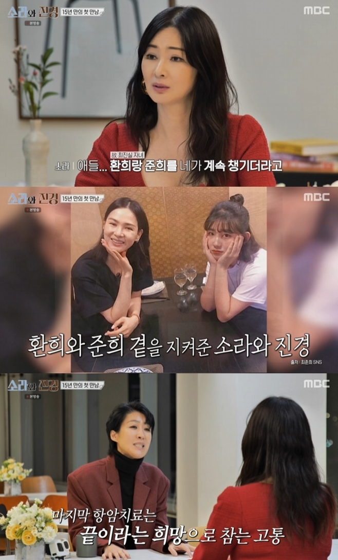 지난 26일 방송된 MBC ‘소라와 진경’에서 홍진경은 15년 만에 만난 이소라로부터 “정말 대단한 게 환희랑 준희를 계속 챙기더라”며 “내 아이와 가족의 조카를 챙기기도 어려운데 어떻게 이렇게 평생 챙길 수 있을까 싶었다”라는 말을 들었다.