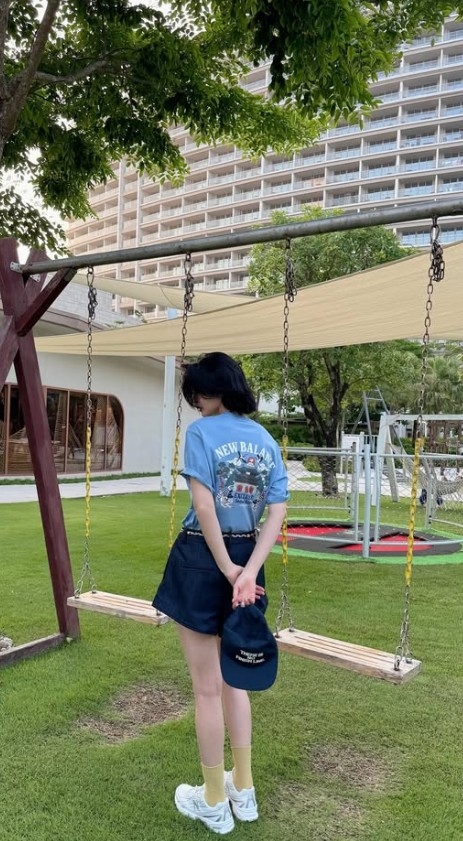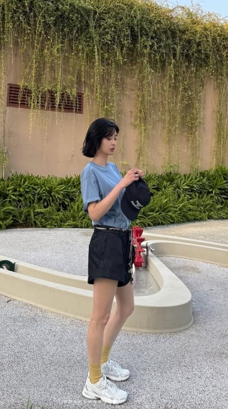 스타일링은 간결하다. 하늘색 반팔 티셔츠에 네이비 쇼츠를 매치했다. 여기에 화이트 스니커즈와 옐로우 양말을 더해 색감 대비를 살렸다. 허리에는 스트랩 장식을 더해 포인트를 줬다.