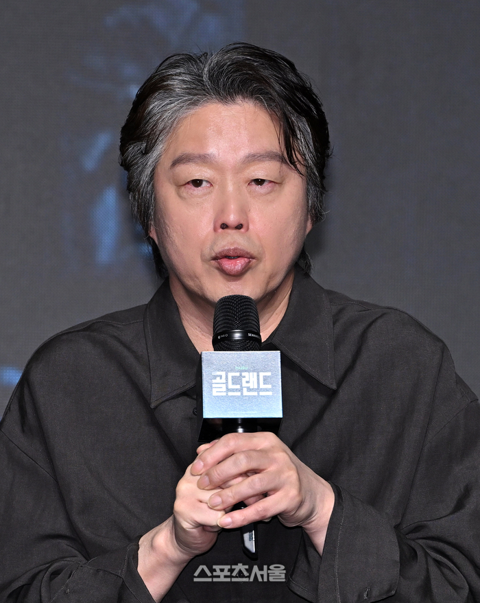 배우 이광수가 27일 서울 여의도 콘래드 호텔에서 진행된 디즈니+ 오리지널 시리즈 ‘골드랜드’ 제작발표회에서 사회자의 질문에 답을 하고 있다.