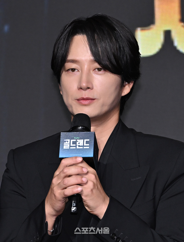 배우 이현욱이 27일 서울 여의도 콘래드 호텔에서 진행된 디즈니+ 오리지널 시리즈 ‘골드랜드’ 제작발표회에서 사회자의 질문에 답을 하고 있다.