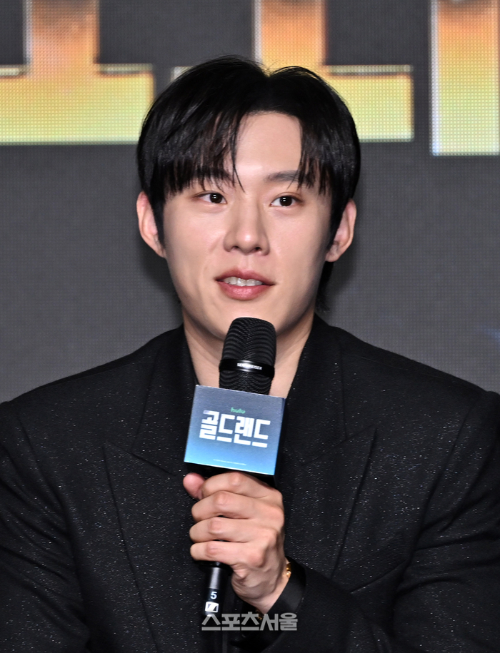 배우 김성철이 27일 서울 여의도 콘래드 호텔에서 진행된 디즈니+ 오리지널 시리즈 ‘골드랜드’ 제작발표회에서 사회자의 질문에 답을 하고 있다.
