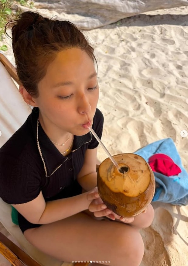 또 다른 사진에서는 코코넛 음료를 마시며 여유를 즐긴다. 휴양지 특유의 느린 시간 속에서 일상을 보내는 모습이다. 전체적으로 힘을 뺀 동작과 표정이 편안함을 전한다.