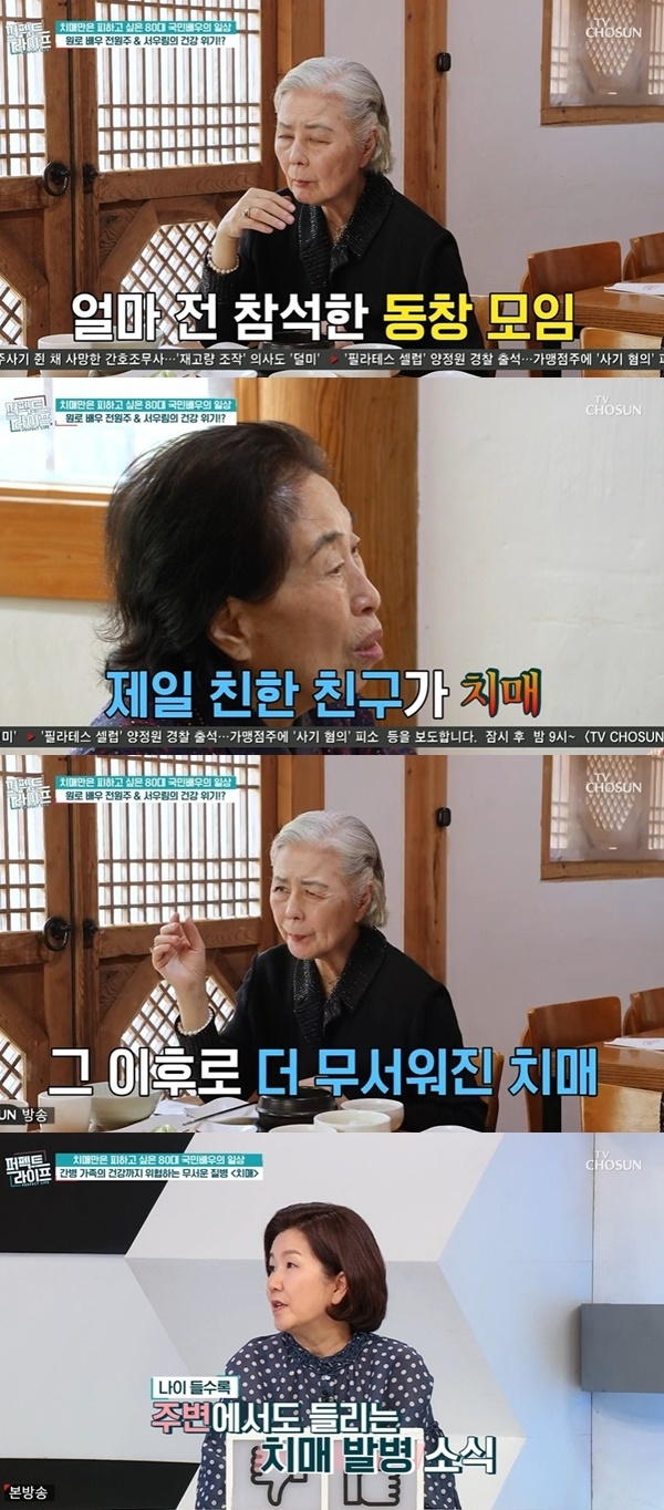 지난 29일 방송된 TV조선 ‘퍼펙트 라이프’에서 전원주는 “요즘 깜빡깜빡하는 증상이 잦아졌다”며 “사람을 잘 못 알아봐서 오해받기도 하고, 얼굴은 아는데 이름이 생각이 안 나서 걱정이다”라고 고민을 털어놓았다.