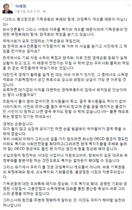 지난 6일 이재명 성남시장은 자신의 페이스북에 "그리스 붕괴원인은 기득권층의 부패와 탈세, 과잉복지, 게으름 때문이 아닙니다"는 장문의 글을 게재했다.