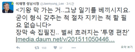 이어 이재명 성남시장은 "굳이 형식 갖추는 척 절차 지키는 척 할 필요 없습니다"라며 '장막 속 집필진…벌써 흐려지는 투명 편찬'이라는 기사를 링크했다.