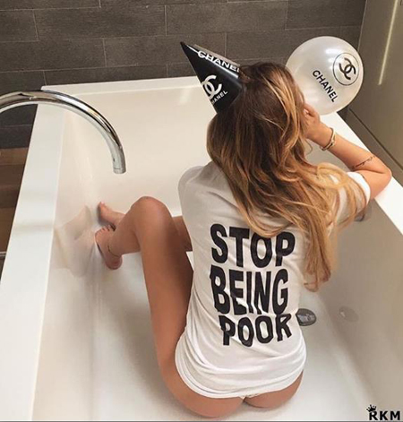 공개된 또 다른 사진 속에는 '가난은 그만!'이라고 문구가 적힌 티셔츠를 입고 명품 브랜드의 고깔과 풍선을 부는 모습이 담겨있다.